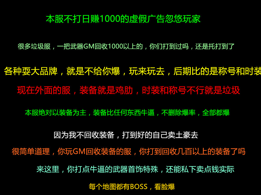 游戏介绍:本服为了方便大家,所有货币都是互换的,本服无回馈地图,无隐藏消费!所有一切靠打!